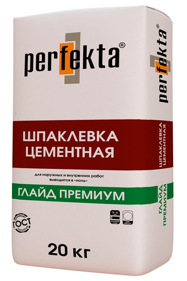 ШПАКЛЕВКА ЦЕМЕНТНАЯ Perfekta® «ГЛАЙД ПРЕМИУМ» предназначена для высококачественного финишного выравнивания фасадов зданий, а также стен и потолков из бетона, ячеистого бетона, оштукатуренных поверхностей, ГКЛ, ГВЛ, ЦСП, СМЛ под последующее нанесение декоративных покрытий в сухих и влажных помещениях. Используется также для заделки трещин, выбоин, углублений.